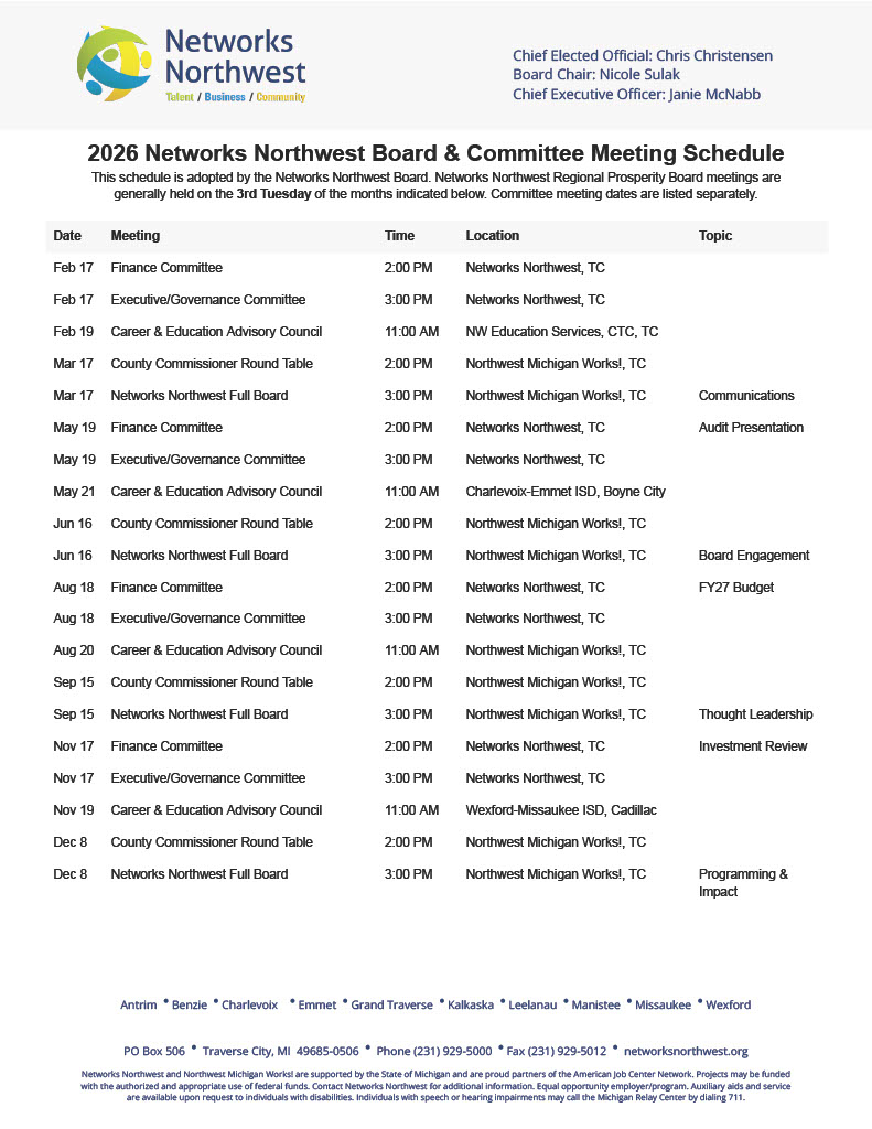 - To provide oversight for financial and operational effectiveness. This is done largely through three committees: Executive/Governance; Finance/Audit; Career Education Advisory Council. If you would like agendas or minutes for any of these committees, please contact Networks Northwest at 231-929-5000.
