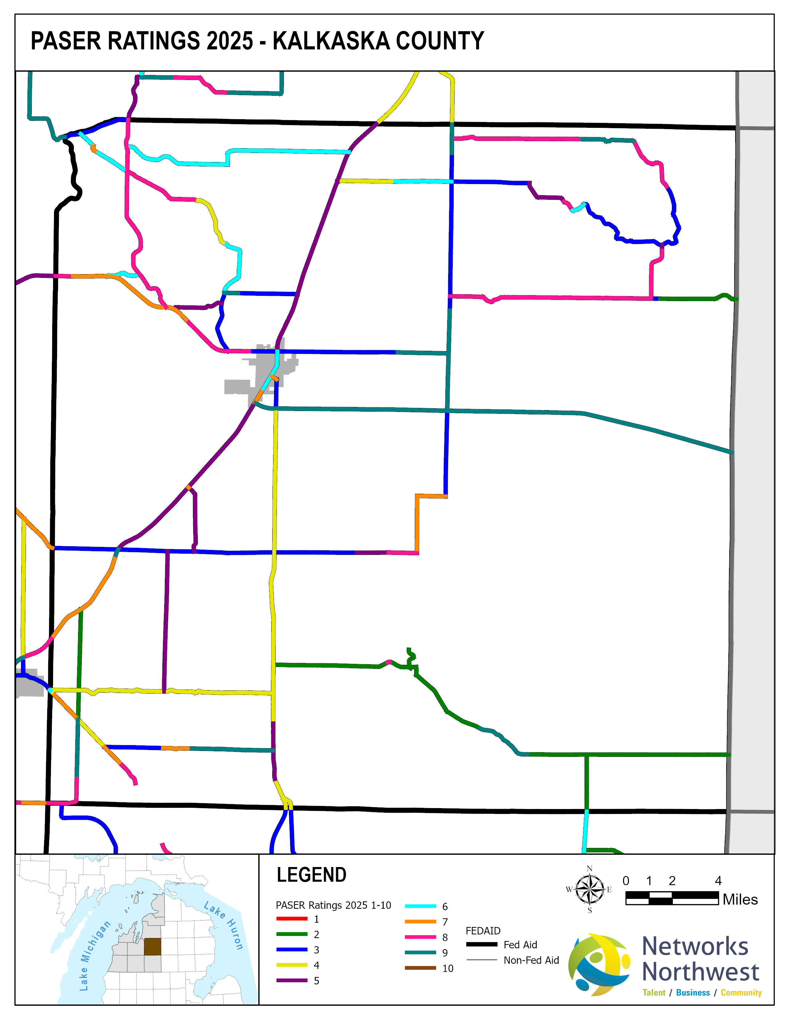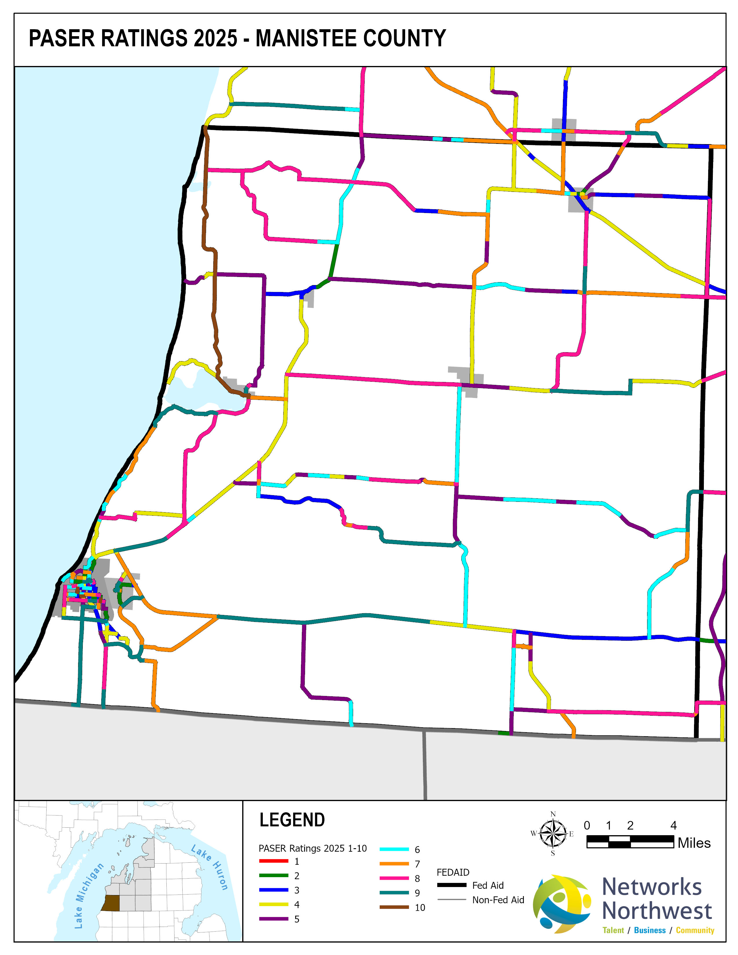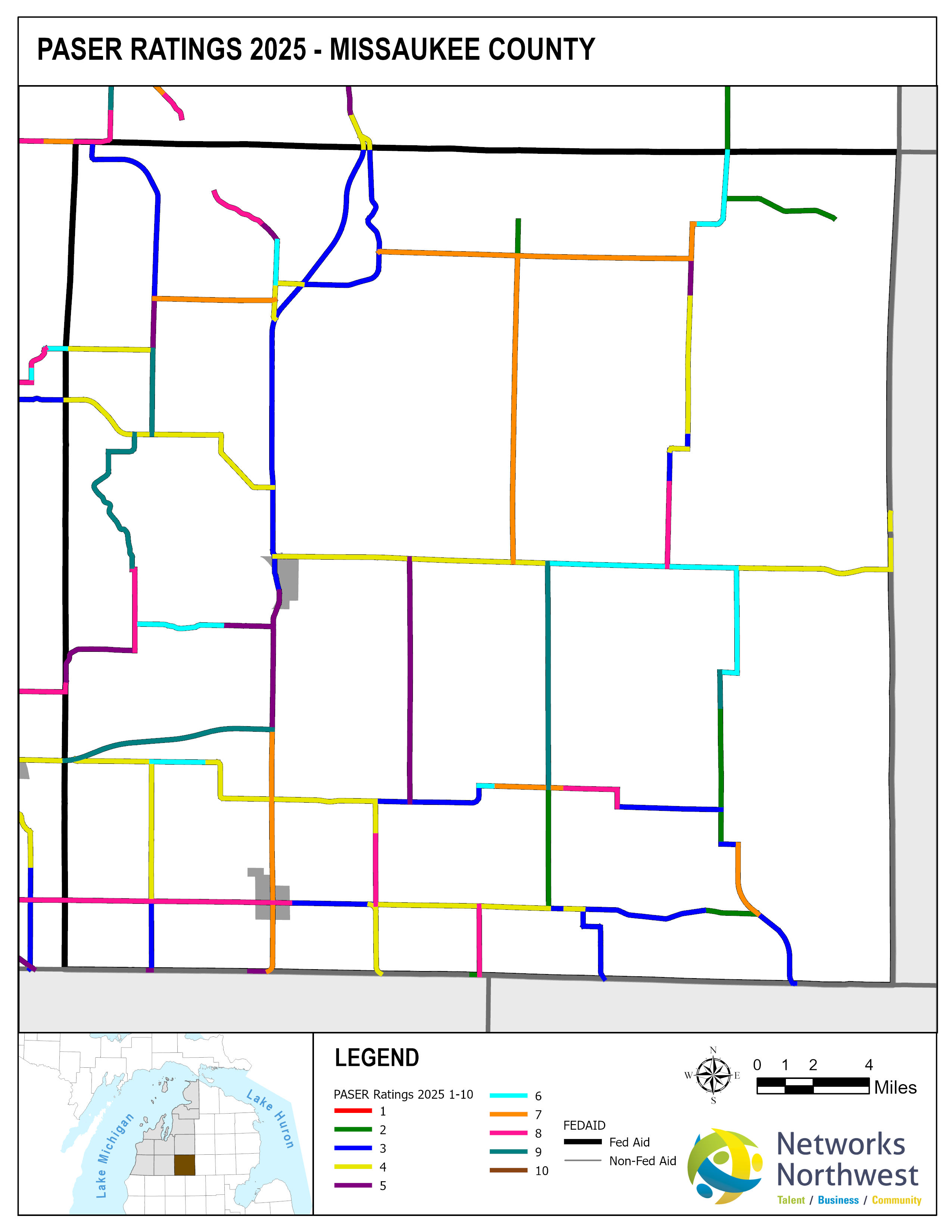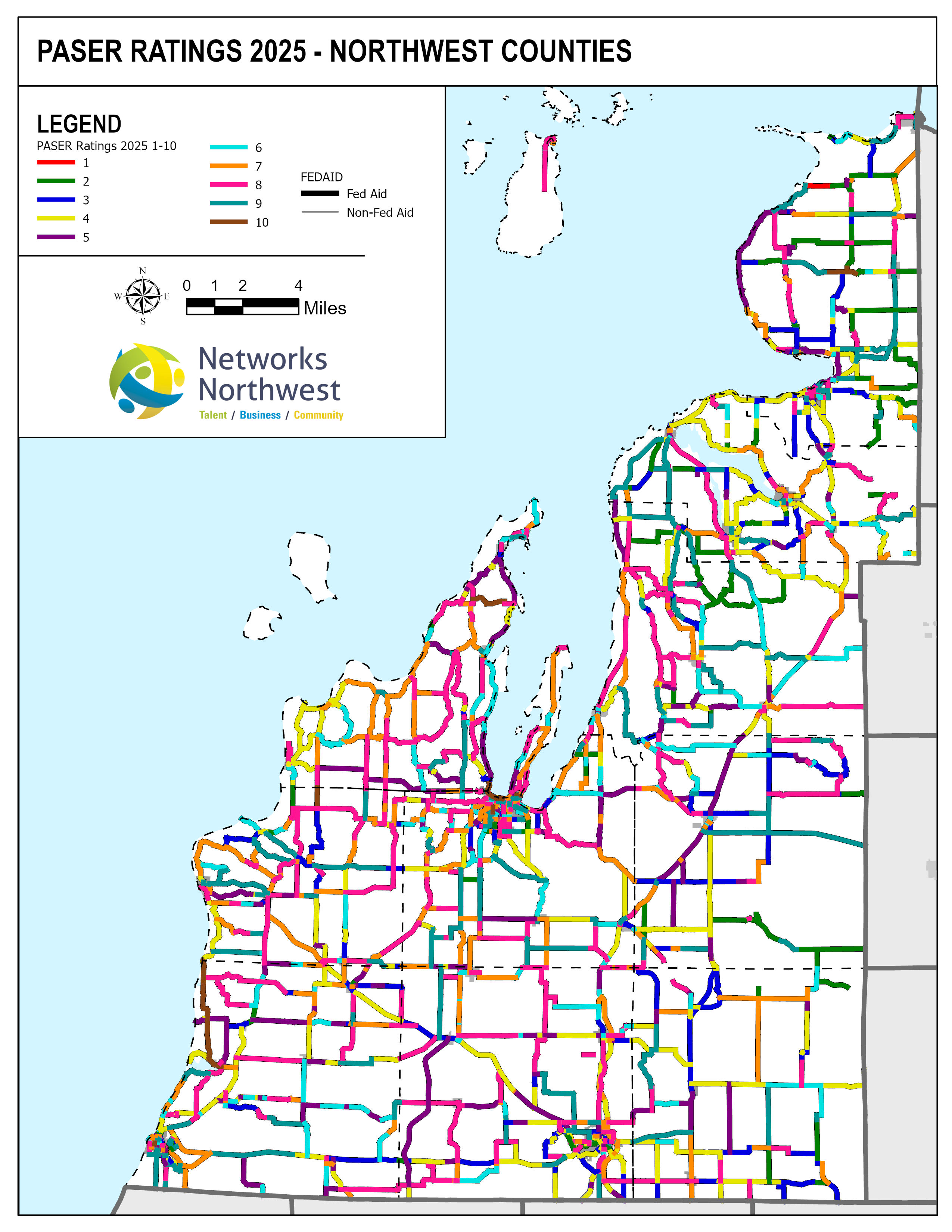Networks Northwest Community Development staff provide regional support for the program, which includes: administrative support, liaison activities between the counties and MDOT, training, scheduling of inventory times, data collection, and equipment handling. Data collection is coordinated with a County Road Commission employee, a representative from a local MDOT office, and Networks Northwest staff utilizing the PAvement Surface Evaluation Rating (PASER) system on all Federal-Aid eligible roads. The PASER system rates on a 1-10 linear scale, with 1 being poor and 10 excellent.