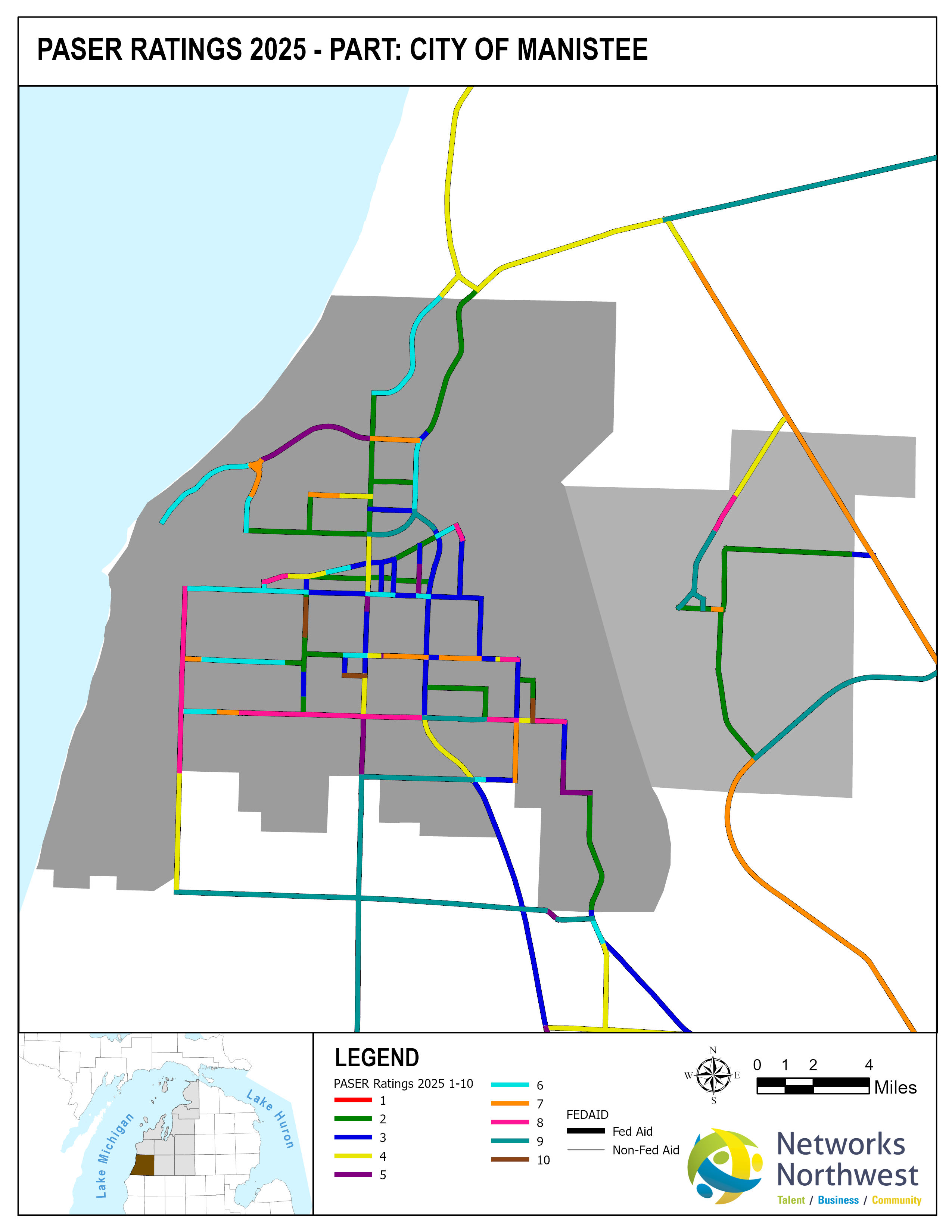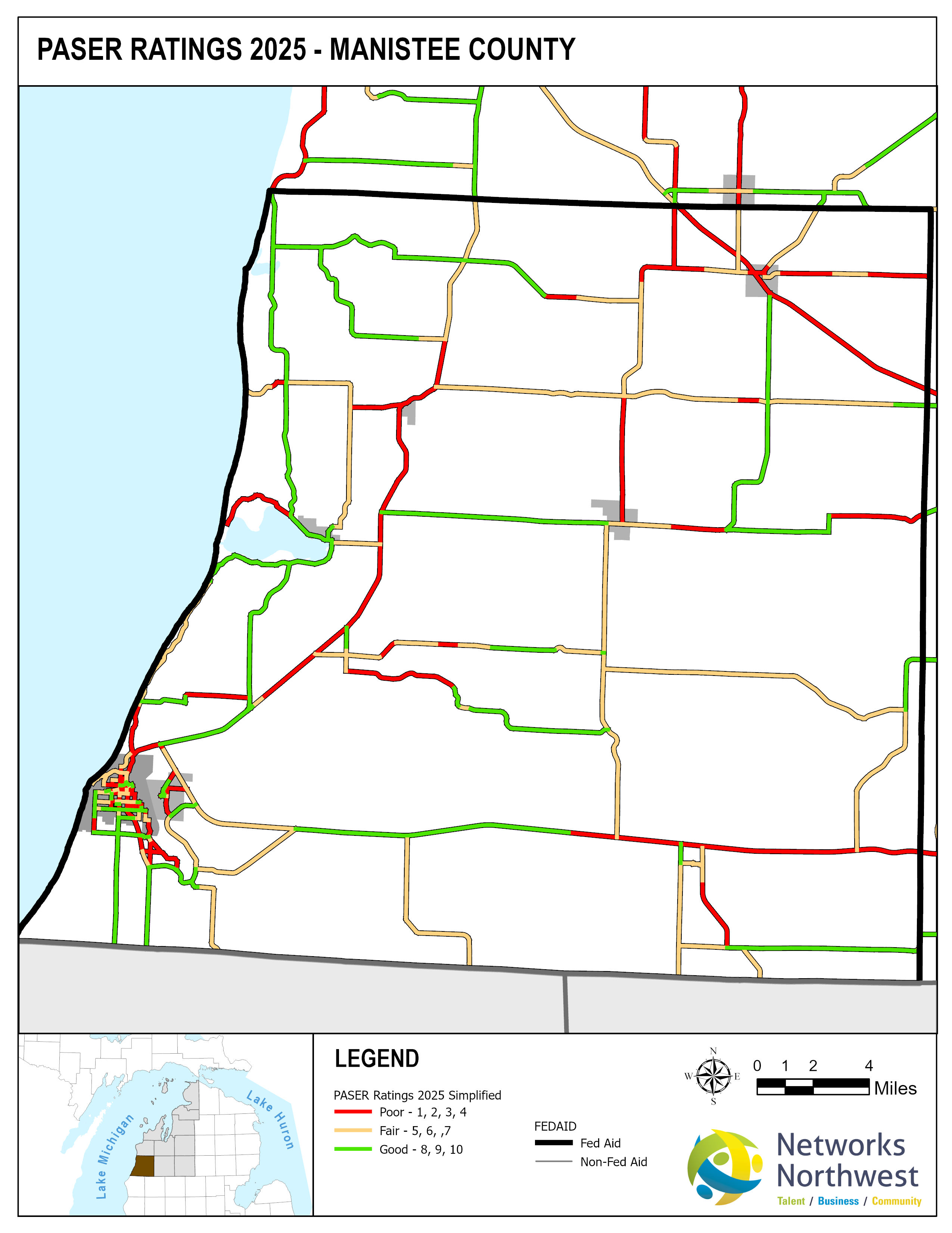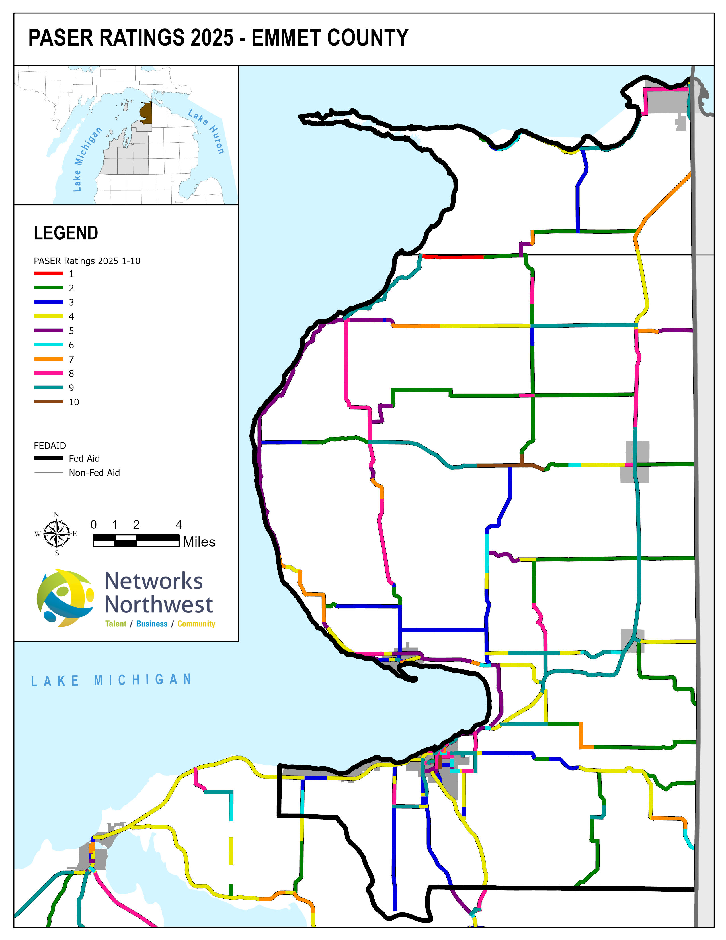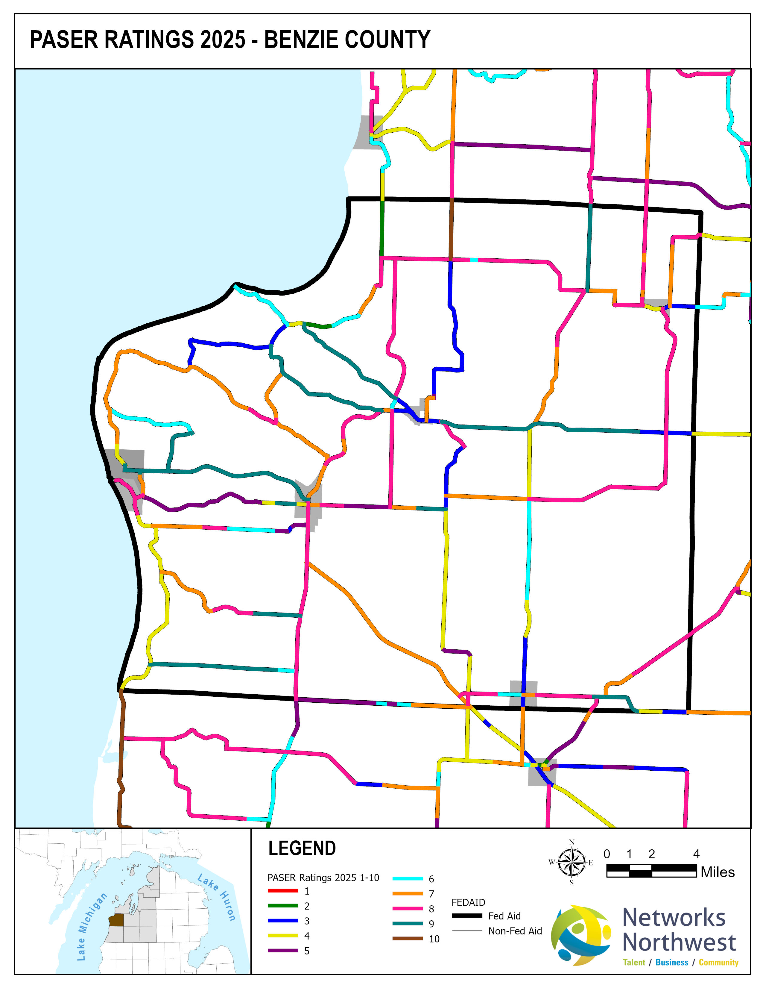 Networks Northwest Community Development staff provide regional support for the program, which includes: administrative support, liaison activities between the counties and MDOT, training, scheduling of inventory times, data collection, and equipment handling. Data collection is coordinated with a County Road Commission employee, a representative from a local MDOT office, and Networks Northwest staff utilizing the PAvement Surface Evaluation Rating (PASER) system on all Federal-Aid eligible roads. The PASER system rates on a 1-10 linear scale, with 1 being poor and 10 excellent.