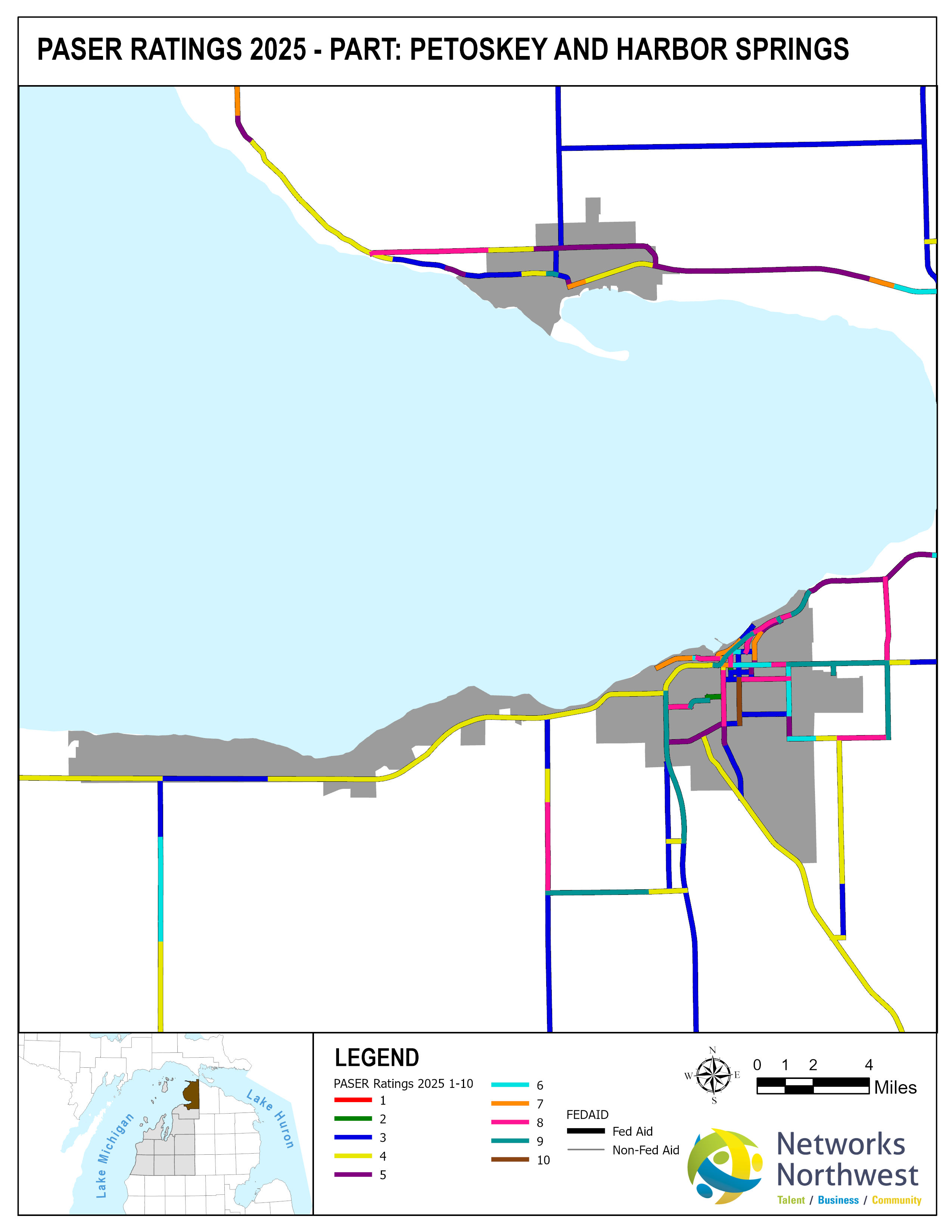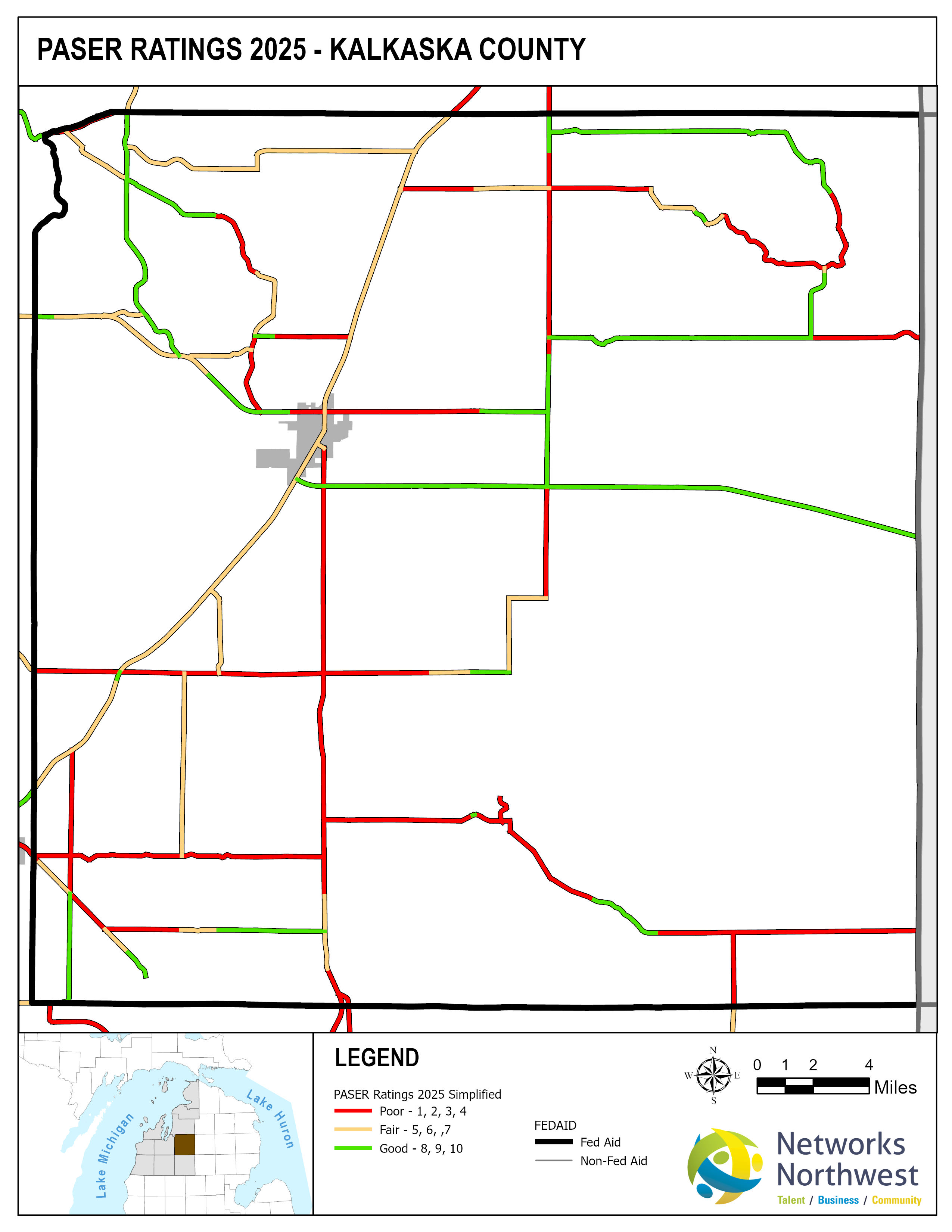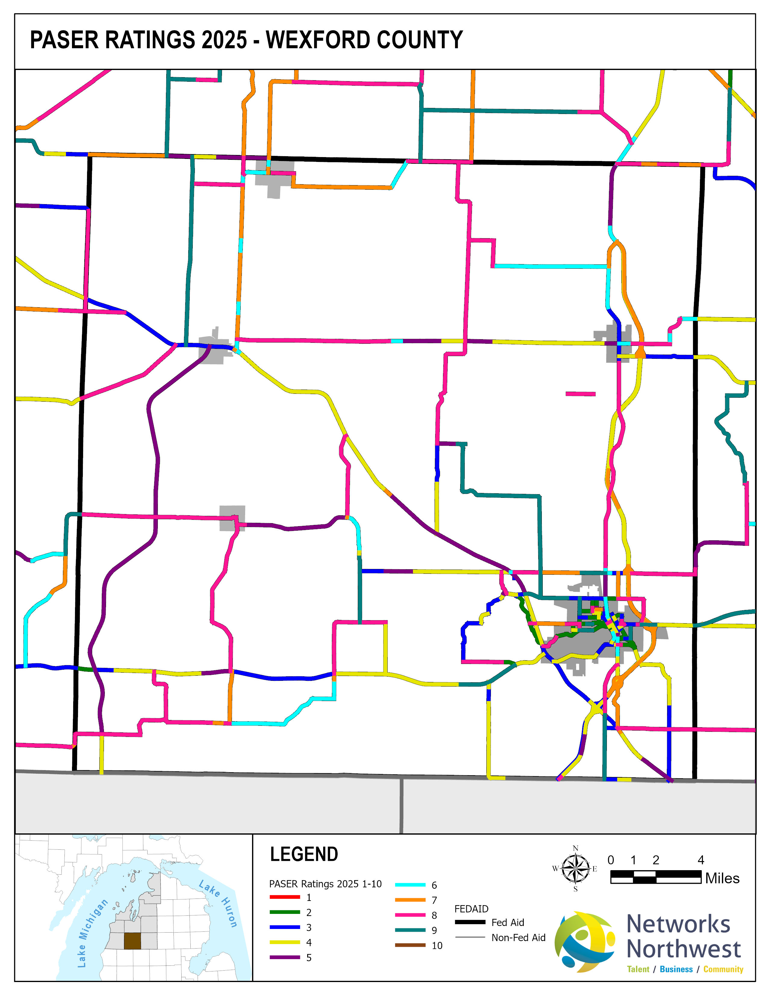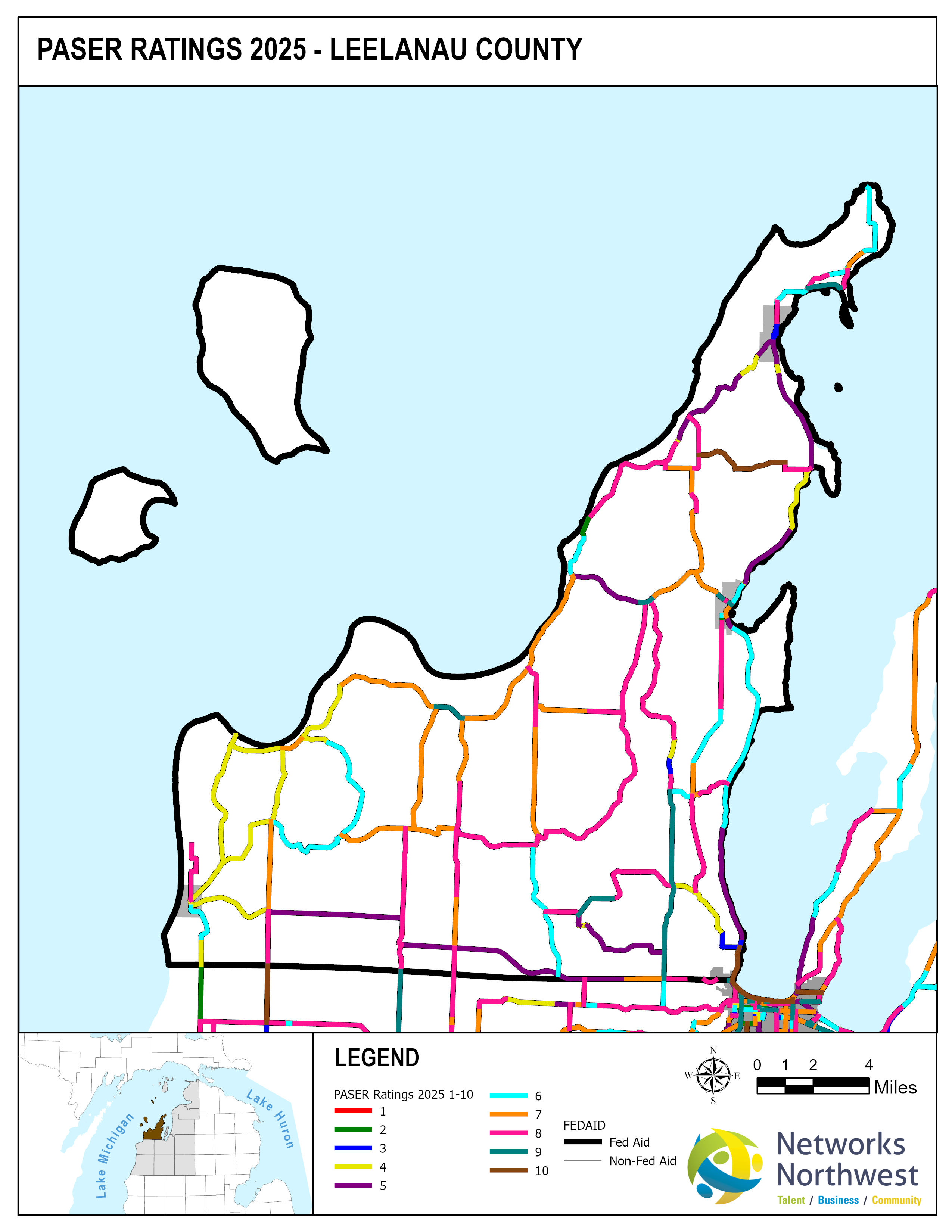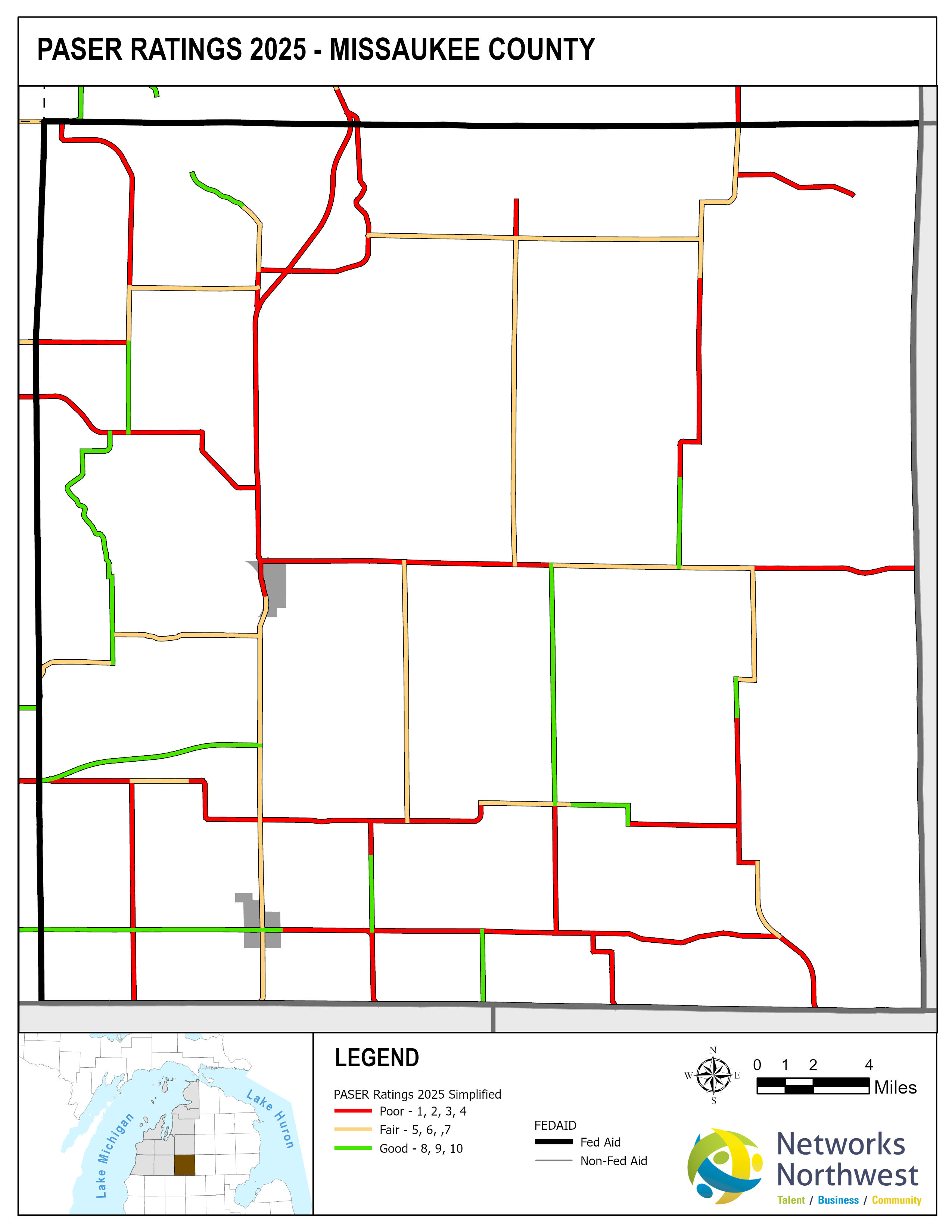 Networks Northwest Community Development staff provide regional support for the program, which includes: administrative support, liaison activities between the counties and MDOT, training, scheduling of inventory times, data collection, and equipment handling. Data collection is coordinated with a County Road Commission employee, a representative from a local MDOT office, and Networks Northwest staff utilizing the PAvement Surface Evaluation Rating (PASER) system on all Federal-Aid eligible roads. The PASER system rates on a 1-10 linear scale, with 1 being poor and 10 excellent.