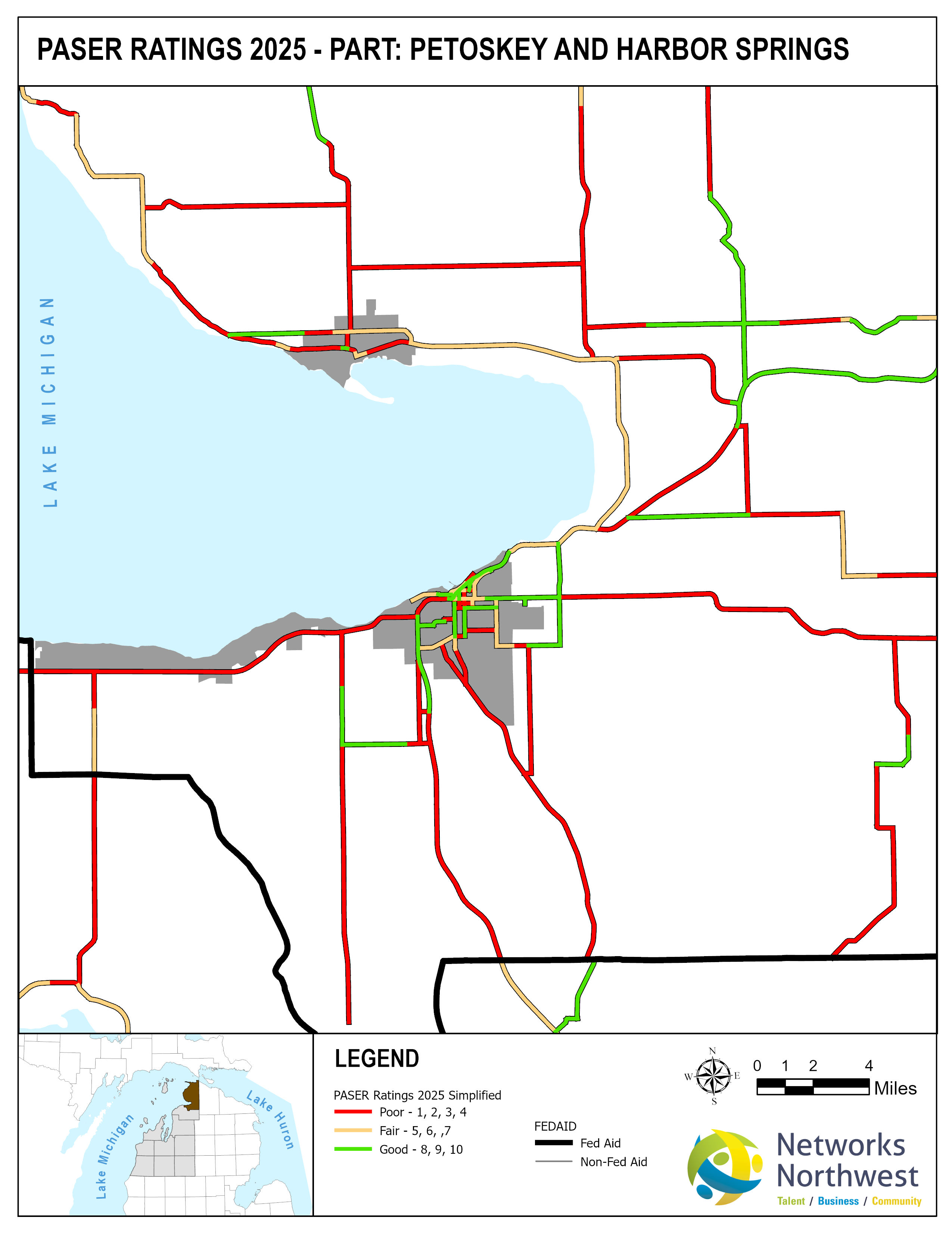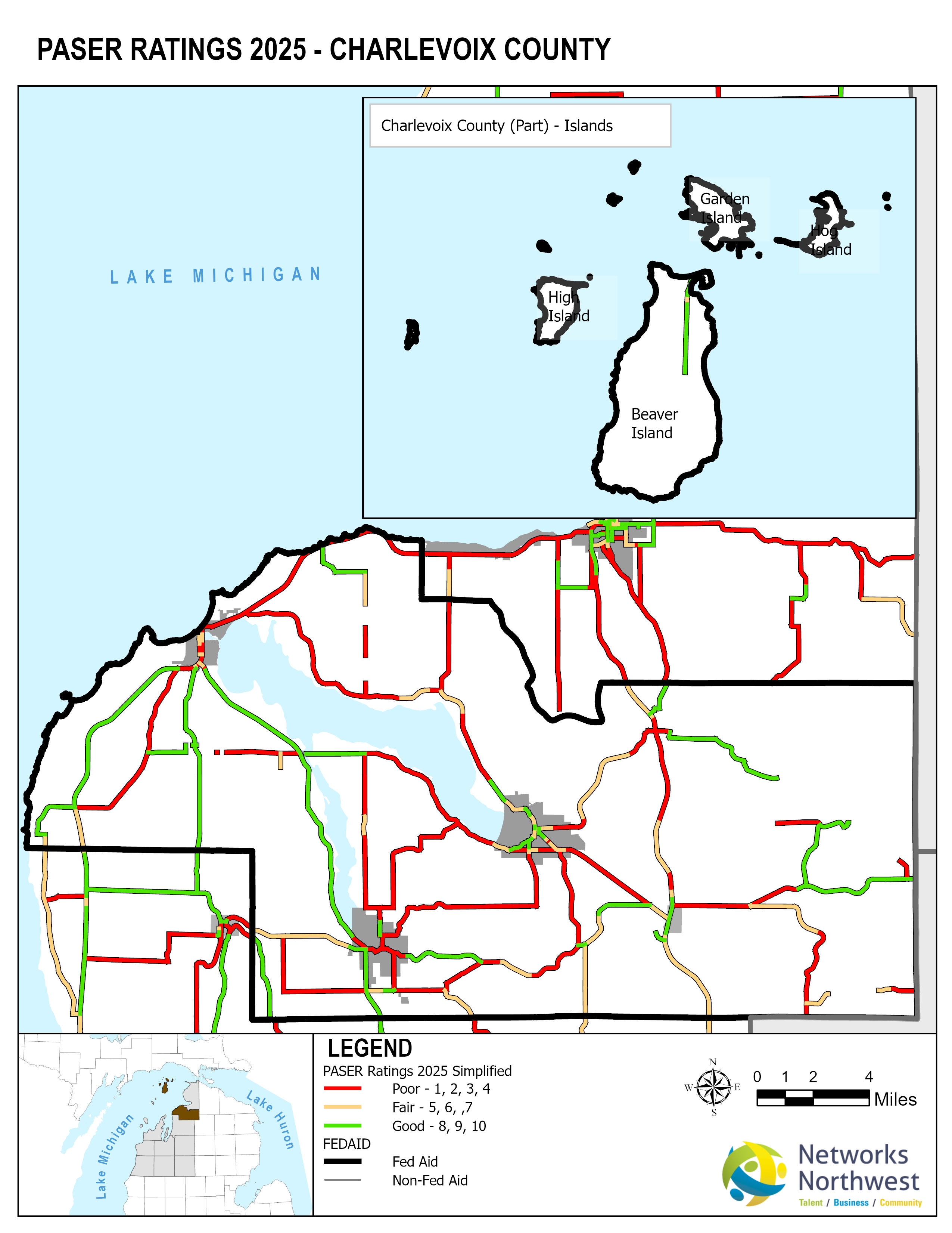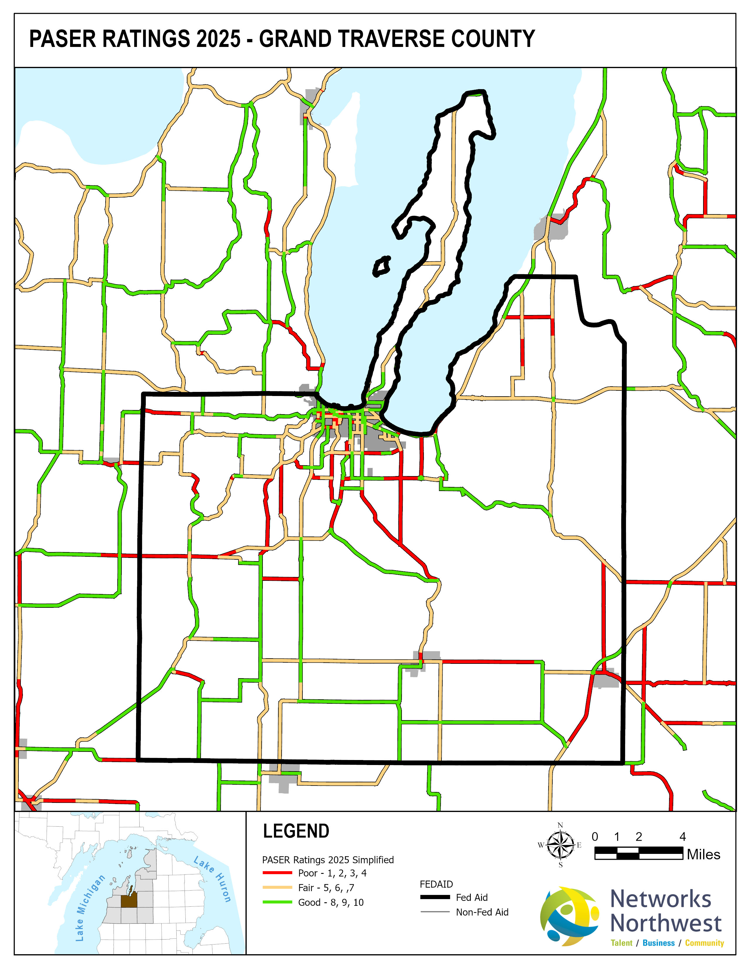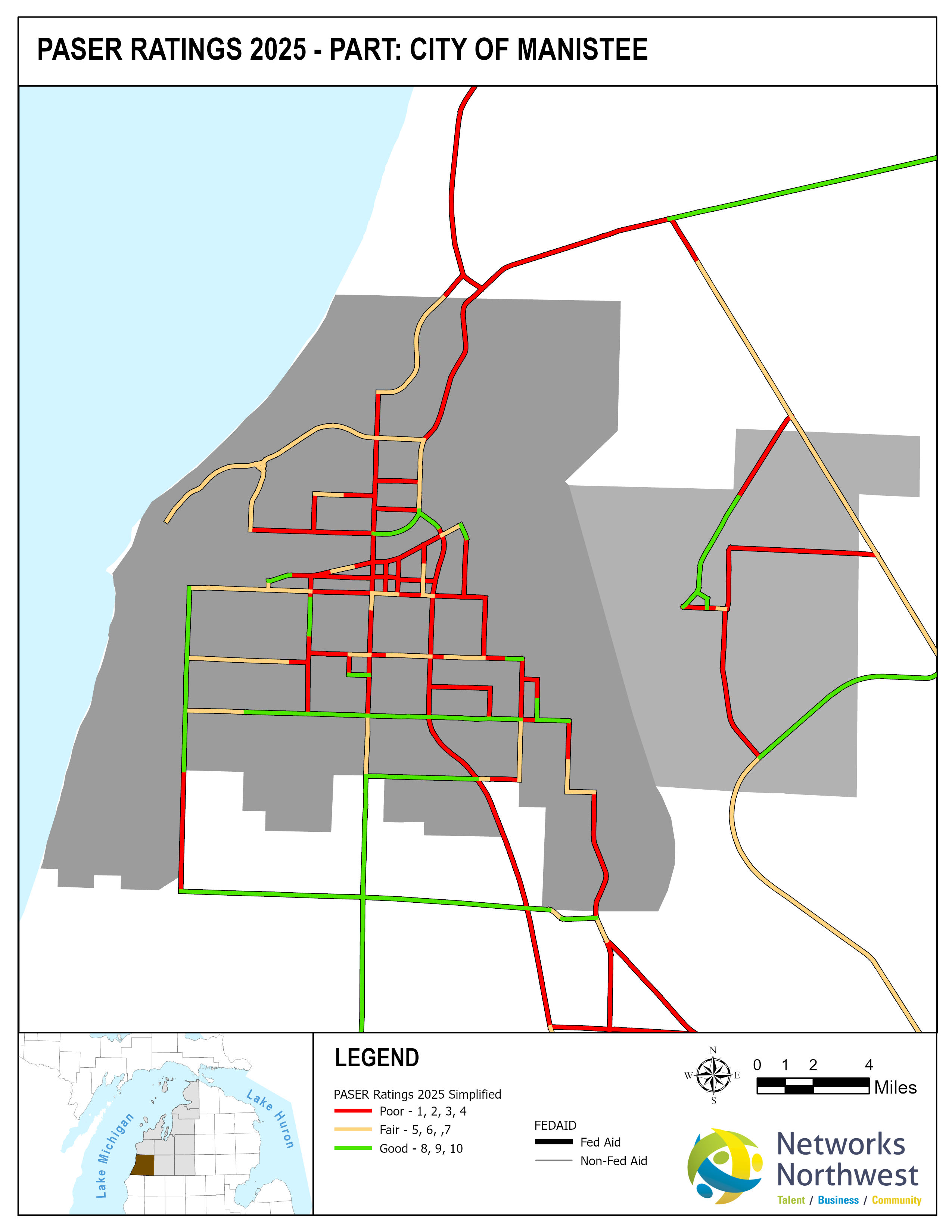 Networks Northwest Community Development staff provide regional support for the program, which includes: administrative support, liaison activities between the counties and MDOT, training, scheduling of inventory times, data collection, and equipment handling. Data collection is coordinated with a County Road Commission employee, a representative from a local MDOT office, and Networks Northwest staff utilizing the PAvement Surface Evaluation Rating (PASER) system on all Federal-Aid eligible roads. The PASER system rates on a 1-10 linear scale, with 1 being poor and 10 excellent.